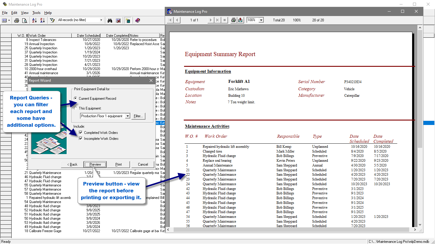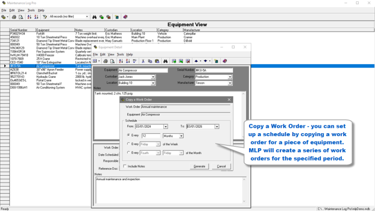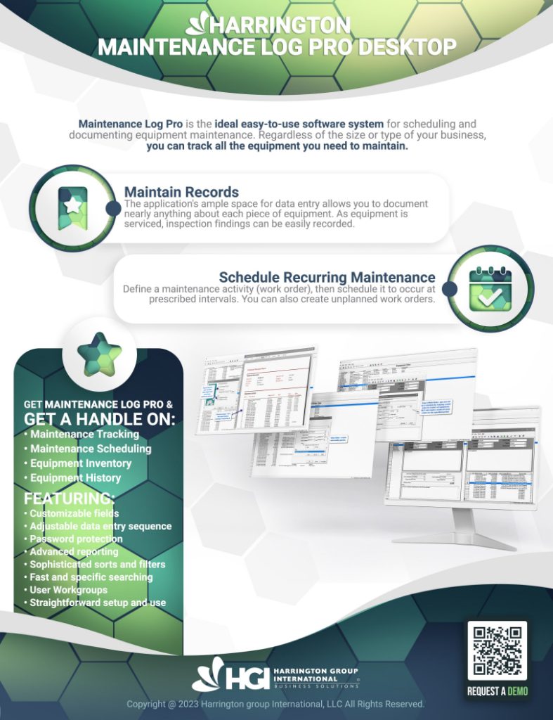 Maintenance Log Pro is the ideal easy-to-use software system for scheduling and documenting equipment maintenance. Regardless of the size or type of your business, you can track all the equipment you need to maintain.